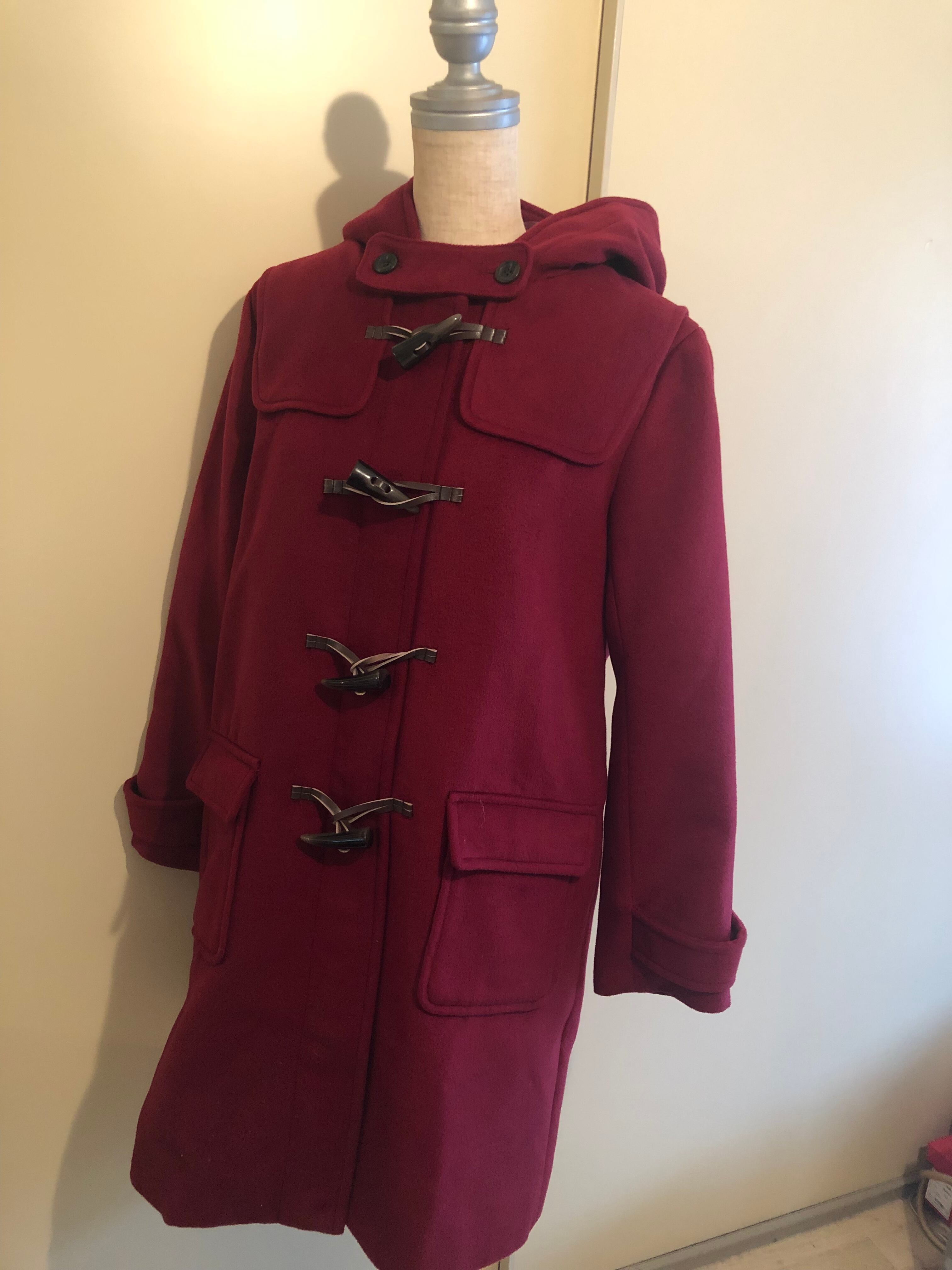 YouTube ビバチャンネルの中で試着したダッフルコート 。私には少しだけ小さな感じ。表記は、レディのLサイズ,肩幅42センチ 着丈90センチ 胸幅50センチ 室内での着用のみ。